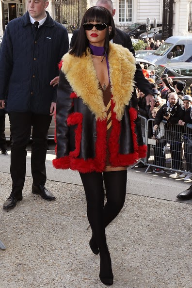 Por mucho que Rihanna se vistiera de Prada (la "hermana mayor" de Miu Miu, más cara dentro de las líneas de la firma), fue para mí la peor en esta ocasión. El abrigo, que combina cuero negro y pelo en color rojo y beige, me parece una pieza que, sencillamente, no debería haber salido de pasarela. Y con más razón si Rihanna la ha combinado con unas botas leggings, un innecesario pañuelo y un minivestido corto y con mucho escote. En fin, un desastre.